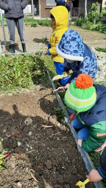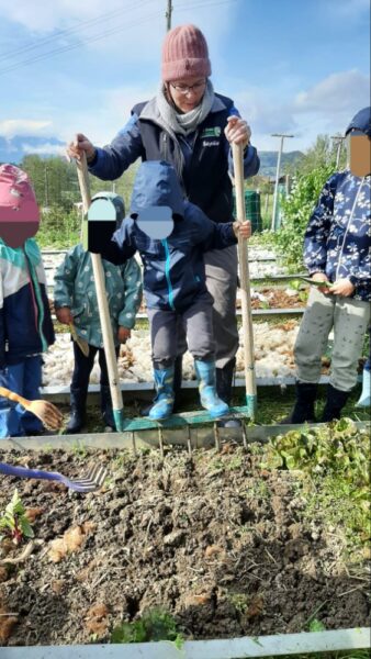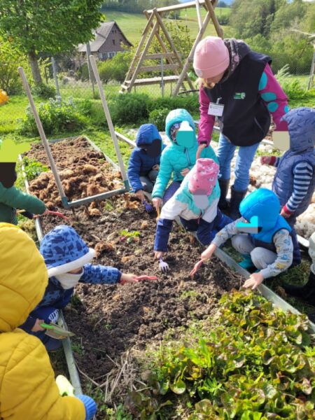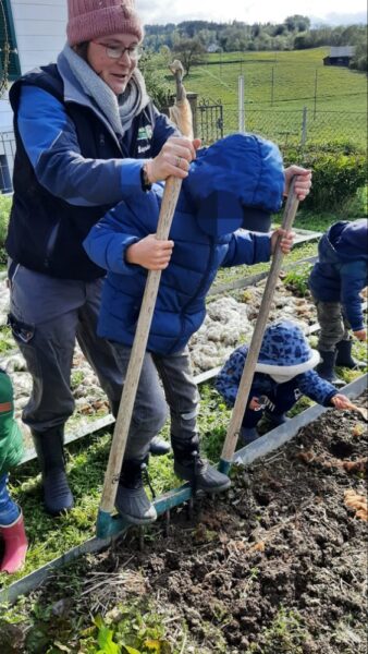 Une fois au jardin, nous commençons par préparer le carreau. Chacun son tour, les enfants aèrent la terre, l’égalisent puis ils plantent colraves et salades. Sans oublier de recouvrir le carreau avec la laine de mouton. Qui va le protéger du sec, des fortes intempéries et qui protège du gel en hiver.