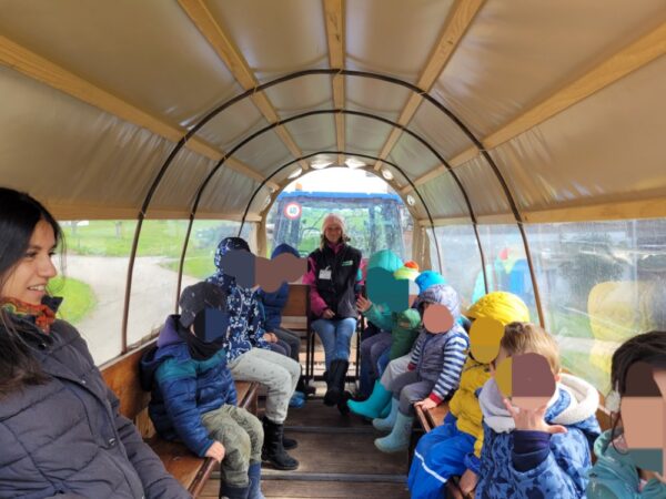 Voici l’heure du goûter bien mérité. Une fois désaltérés et repus, afin de finir l’année scolaire en beauté, nous partons faire un tour en chariote au bord de la forêt. La cerise sur le gâteau!