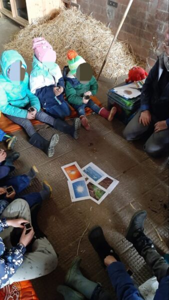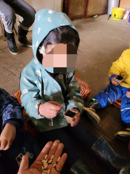 A l’abri de la bise, nous faisons un semi de haricot jaune que les enfants pourront prendre avec eux à la maison. Nous finissons par parler des besoins des plantes pour pousser. De la terre, du compost pour l’engrais, de l’eau, du soleil et de la chaleur.