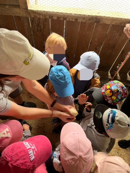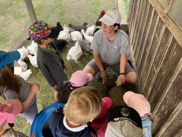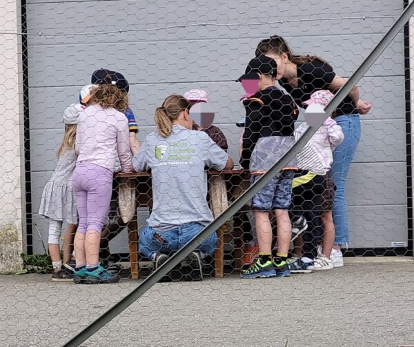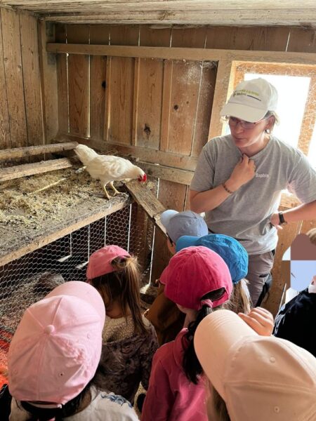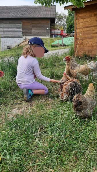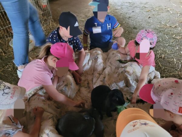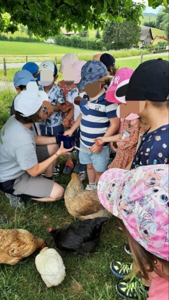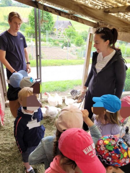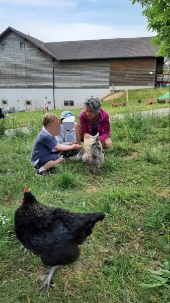 Nous commençons la matinée par découvrir les poussins et les poules. Pour ce faire, nous faisons 2 groupes. Un groupe vient avec moi pour découvrir nos poussins, qui sont déjà bien grand, quelques particularités sur la poule et tout ce qui se trouve dans un poulailler.