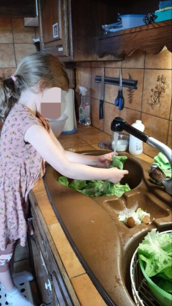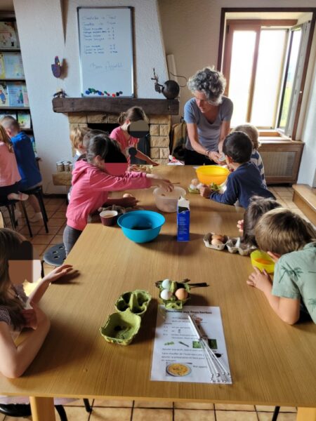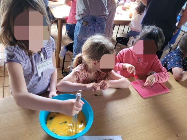 L’heure du repas arrivant à grand pas, nous allons récolter les ingrédients utiles à sa confection. Eh oui, la classe va cuisiner aujourd’hui. Au menu… une omelette aux fines herbes avec salades, Gruyère et pain.