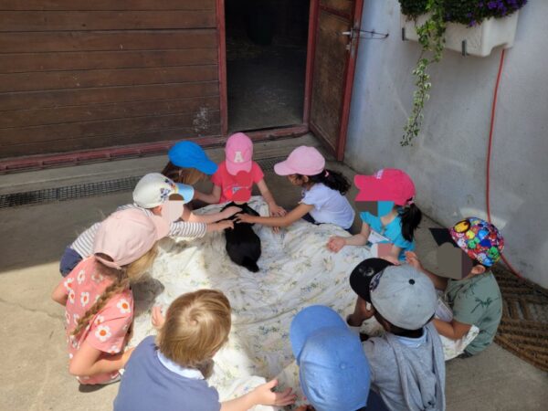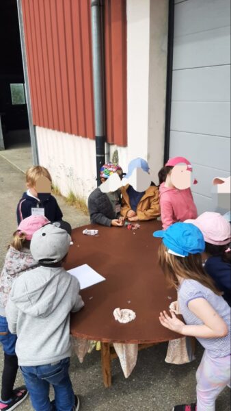 Le deuxième groupe découvre ce que j’ai mis dans la table du toucher lié aux animaux. Nous échangeons les groupes puis nous allons tous donner à manger aux poules qui se trouvent au verger. Quelle joie pour les enfants de faire picorer les poulettes directement dans leurs mains.