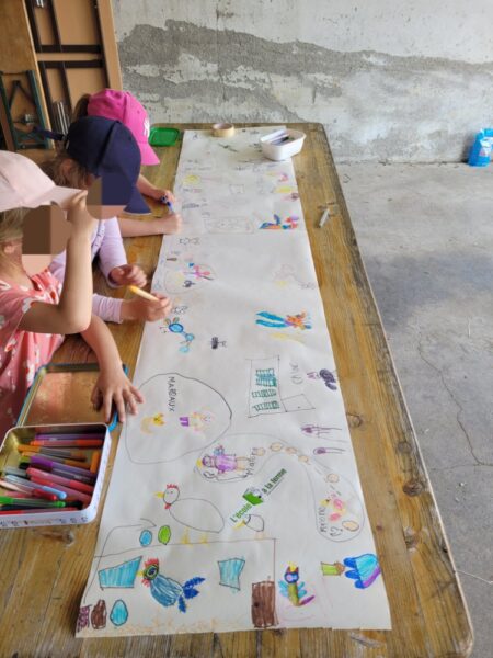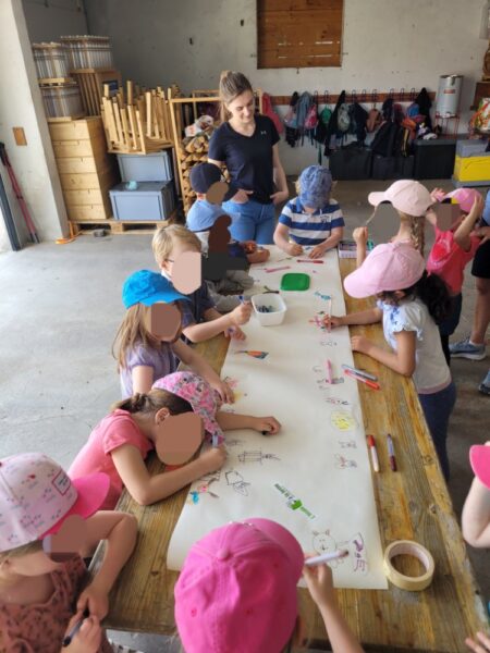 Pour clore la journée en beauté, les élèves peuvent dessiner sur une fresque leur moment préféré de la journée afin d’avoir un souvenir en classe et découvrir le sentier pieds nus. Un joli moment de détente avant le départ. La journée fut trop vite passée! Merci les enfants pour votre joie, votre intérêt et toutes vos questions. Nous avons passé une très belle journée en votre compagnie.
