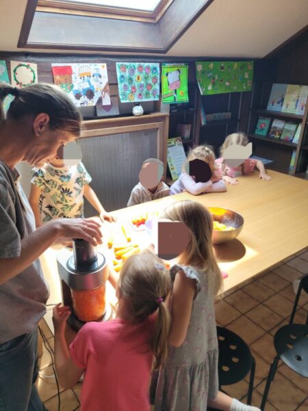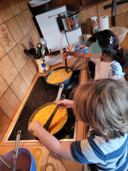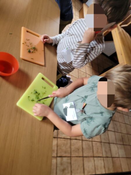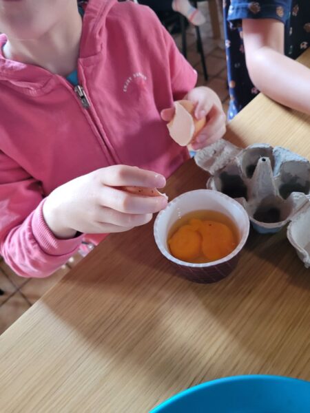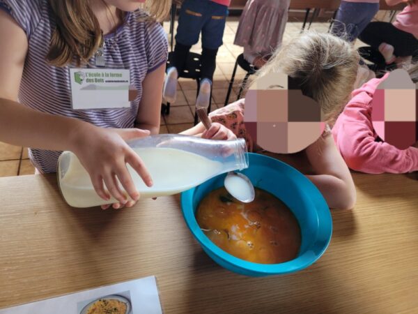 Les mains lavées, manches retroussées, c’est parti pour une petite heure de préparation. Nous commençons par le mélange pour l’omelette. Oeufs cassés, lait mesuré, sel ajouté et fines herbes coupées voici le moment de touiller. Le mélange terminé, chaque élève va éplucher une carotte.