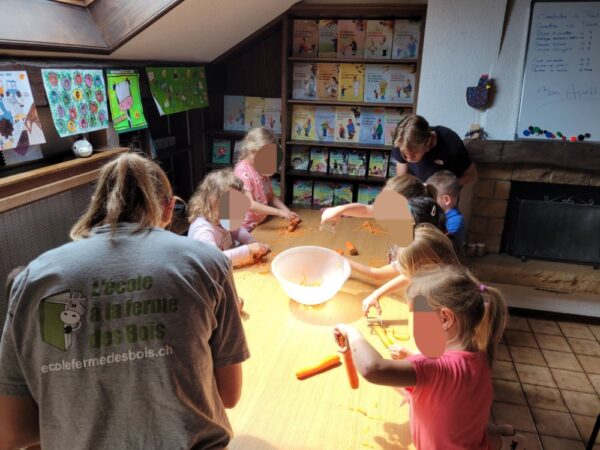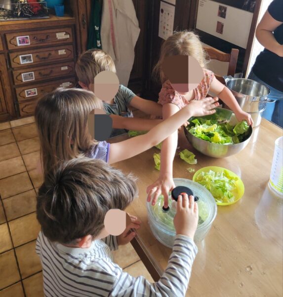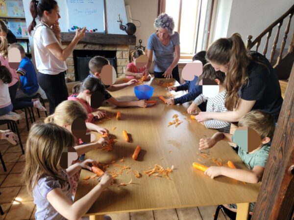 Pour la suite, 1 groupe va couper les bout de carottes et les râper, un groupe prépare la sauce à salade, un groupe lave et essore la salade verte, un groupe coupe le Gruyère en lamelles (de notre laiterie) et 2 élèves vont cuire l’omelette. Toute la préparation étant finie, les élèves mettent la table. Voici l’heure de manger. Bravo les enfants, vous avez été super efficaces!