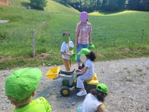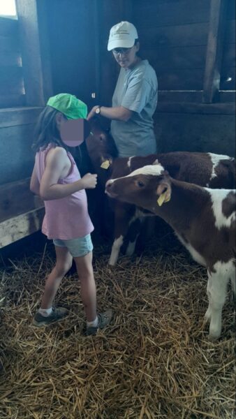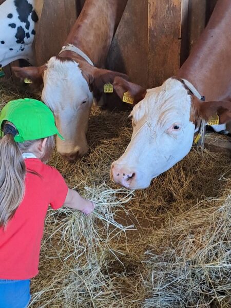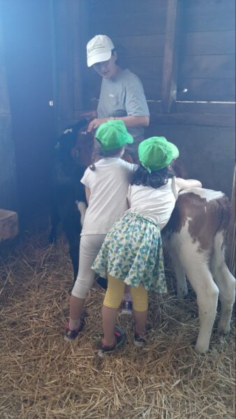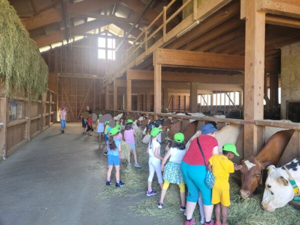 A l’étable, nous allons tout d’abord caresser les vaches. Puis nous observons comment se constitue leur maison. Où dorment les vaches, où elles vont manger et évidemment où elles font leurs besoins.