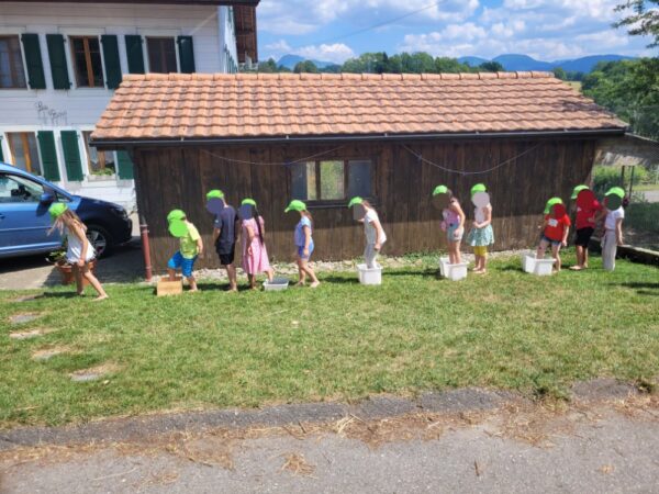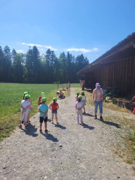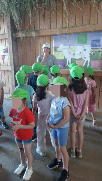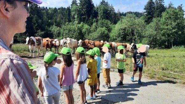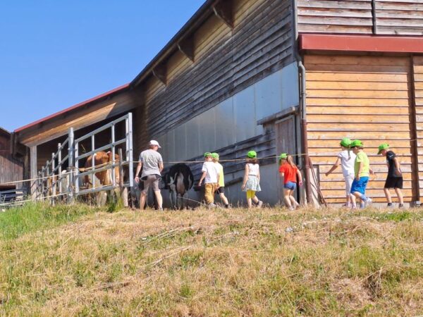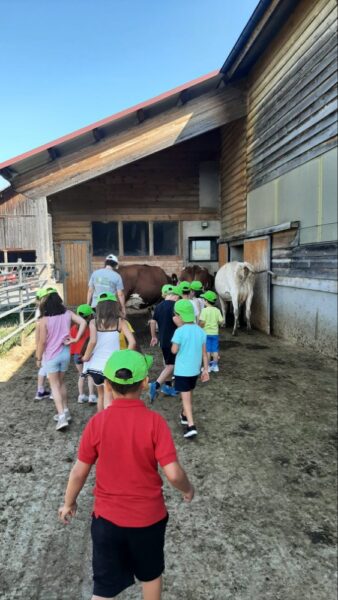 Jeudi, les élèves de Isabelle Simeon Rapin sont venus à la ferme pour leur course d’école. A la ferme, au vu de la chaleur, nous commençons par aller chercher les vaches au parc pour les rentrer dans l’étable. Car quand il fait de grosse chaleur, nous rentrons les vaches en fin de matinée et les ressortons le soir, après la traite. Comme cela elles souffrent moins du soleil.