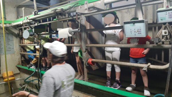 Pour la suite de la matinée, les élèves passent leur permis de tracteur. Un travail d’équipe car sur les cailloux, pas simple de rouler. Puis nous partons tous visiter la salle de traite.