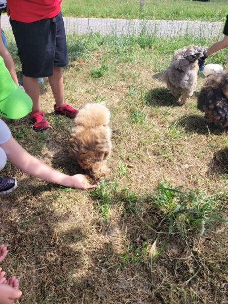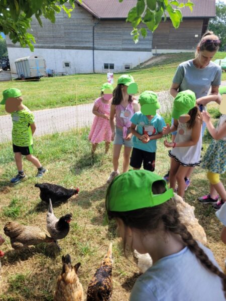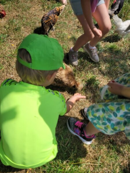 Les câlins terminés, nous allons au poulailler. Pour ce faire, je prend un groupe avec moi pendant que l’autre groupe fait la chasse au trésor de la ferme. Et nous échangeons les groupes afin que chaque élève puisse faire la même chose.
