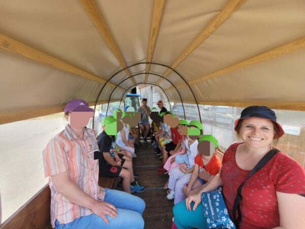 Pour nous rendre à la ferme des Bois, nous faisons le voyage avec la chariote. Que de joie dans les yeux des enfants!