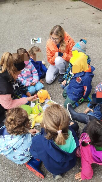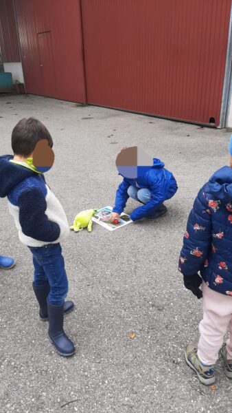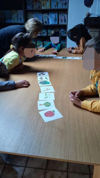 Après une récré bien méritée, nous faisons 2 groupes. Un groupe est avec Emilie pour faire le jeu des saisons. Emilie dépose une image de mon verger à chacun saison au sol puis distribue des jouets ou des images de fruits aux élèves qui vont devoir les placer à la bonne saison. A la fin, ils passent à chaque saison pour discuter de ce qui s’y passe.