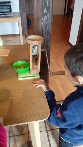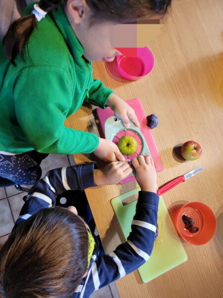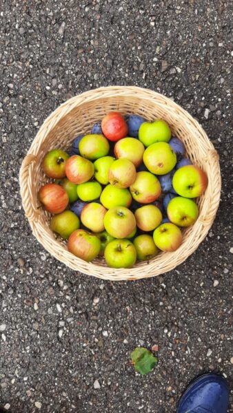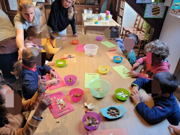 Chaque élève prend 1 pruneau et une pomme qu’ils déposent dans le panier. Une fois la récolte terminée, nous allons en salle les cuisiner pour la récréation.