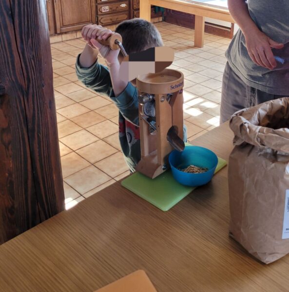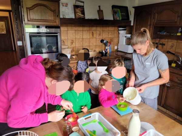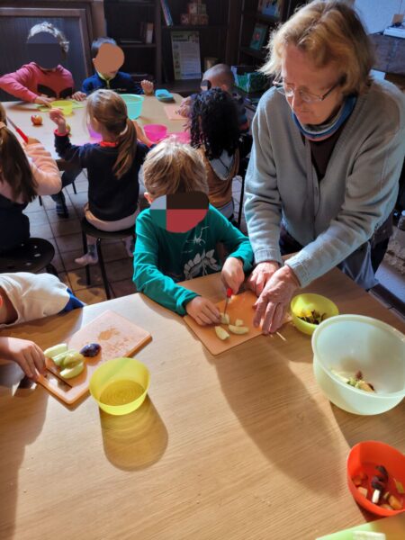 Les élèves vont, chacun leur tour, floconner une portion d’avoine. Ainsi que couper leur pomme et pruneau. Puis ajouter du yogourt et du miel d’Ecoteaux et mélanger le tout.