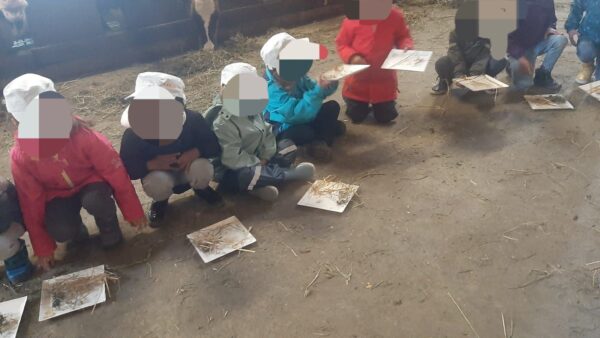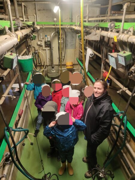 Nous commençons la matinée à l’étable. Les élèves ont pu caresser nos vaches avant que celles-ci aillent paître au parc. Durant la matinée, ils ont également découvert, par un jeu, l’alimentation de la vache et des danger des déchets qui sont au bord des routes dans nos champs. La salle de traite et son fonctionnement, quand est-ce que nous trayons les vaches ou encore ce que nous pouvons produire avec le lait. Je leur explique que la vache doit faire un veau pour produire du lait.