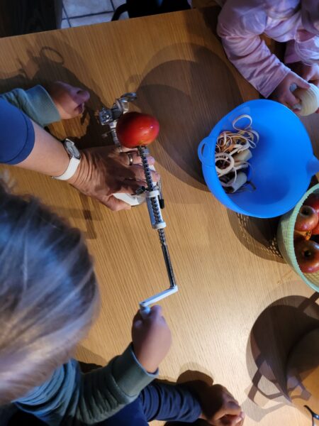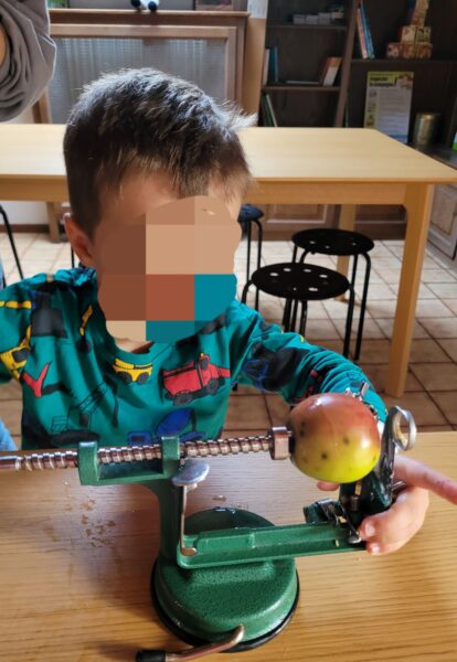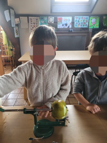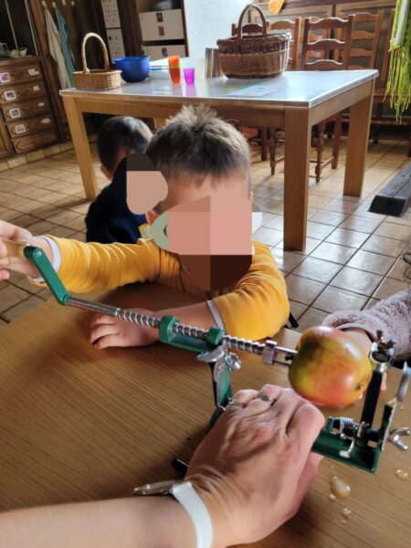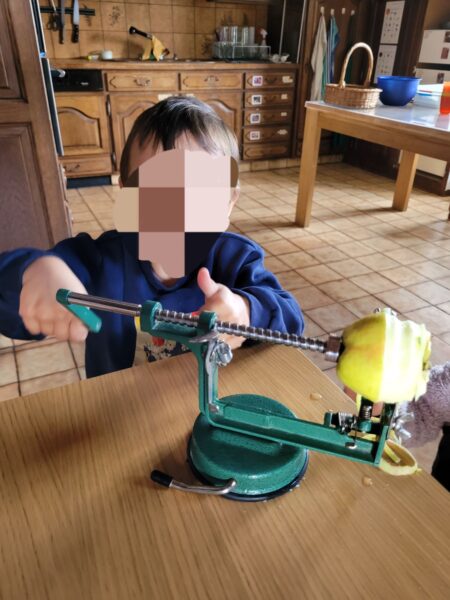 En salle, mains lavées et manches retroussées, nos jeunes lutins sont prêts pour éplucher et couper les pommes. Chacun son tour, ils vont pouvoir utiliser mon épluche/coupe pomme. Que du plaisir !