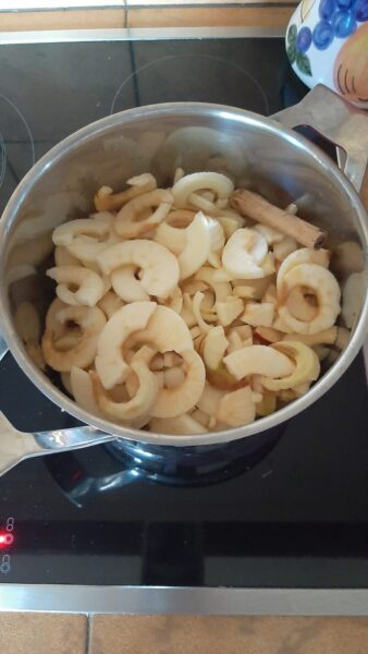Une fois les pommes dans la casserole, nous ajoutons du jus de citron, un bâton de cannelle, un peu de sucre et de l’eau.