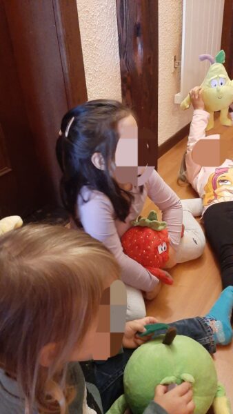 Pendant la cuisson de notre compote nous faisons un jeu avec mes différents doudous/jouets de fruits et insectes. Les enfants piochent dans mon grand sac, une peluche ou un jouet. Chacun son tour, il va présenter son fruit. Je leur demande s’il pousse par terre, dans un buisson ou sur un arbre. Et si c’est un fruit de chez nous ou s’il vient des pays chauds comme l’ananas ou la banane.