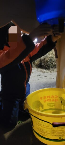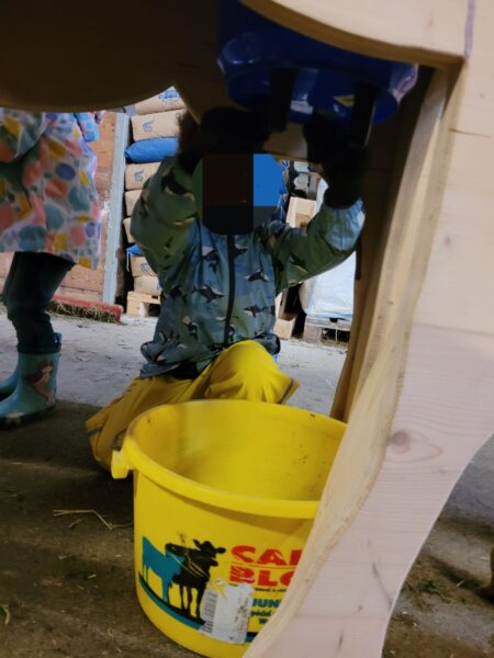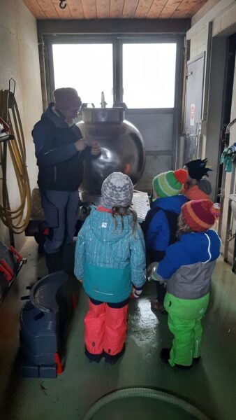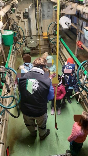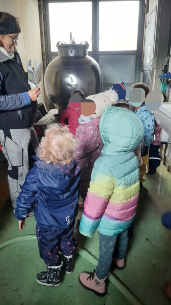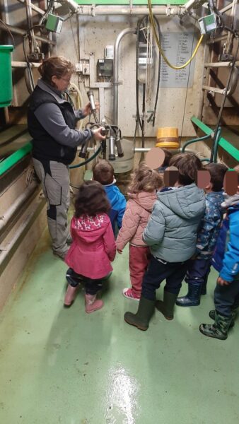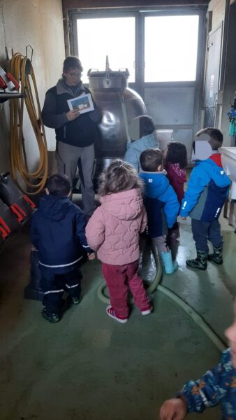Nous continuons notre cheminement par la salle de traite. J’explique aux enfants comment celle-ci fonctionne et quand est-ce que nous trayons les vaches durant la journée. Nous passons par la chambre à lait afin de suivre le chemin du lait de la vache au tank à lait, qui sera livré à la laiterie d’Ecoteaux chaque matin et soir. Et nous parlons de ce que nous pouvons fabriquer avec le lait.