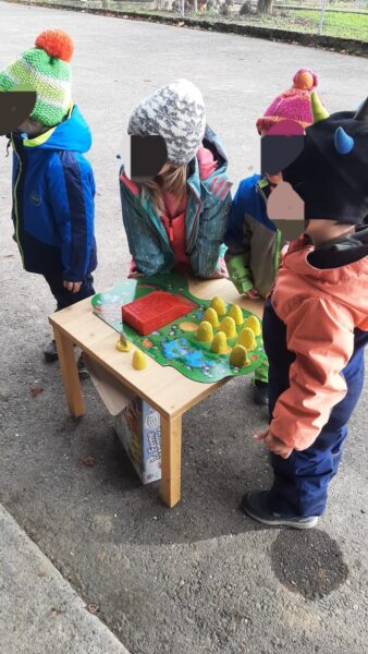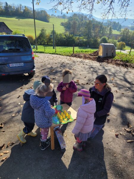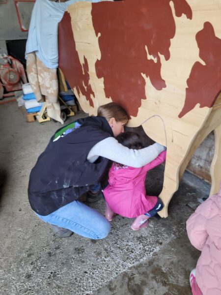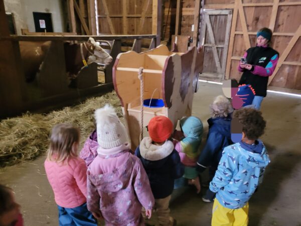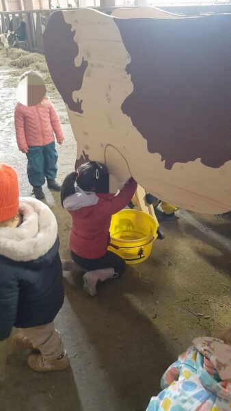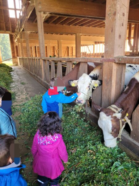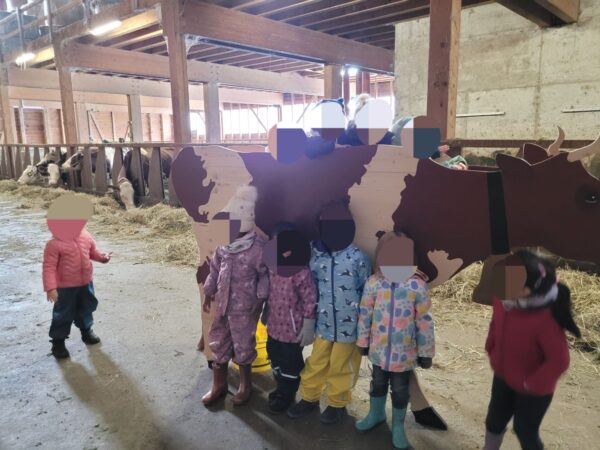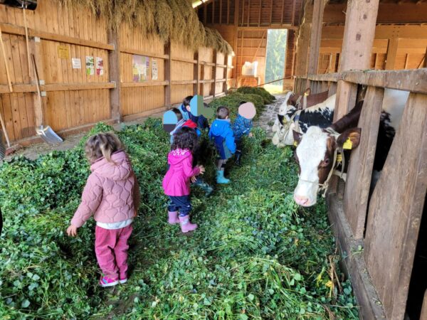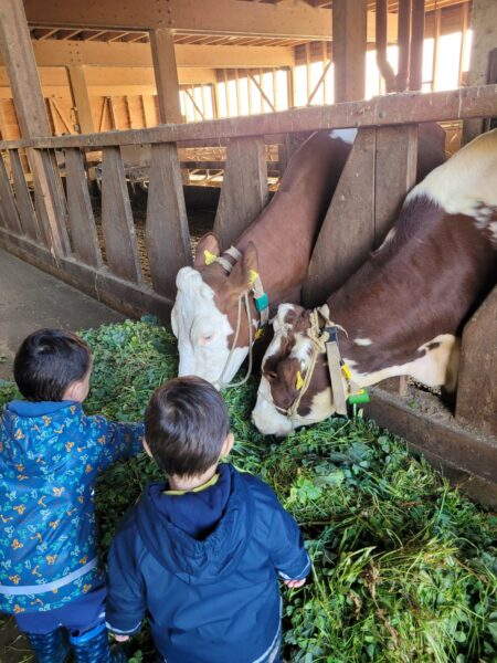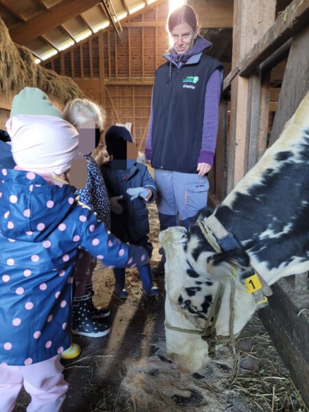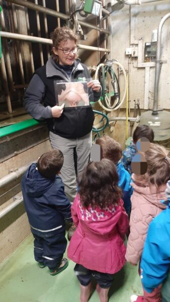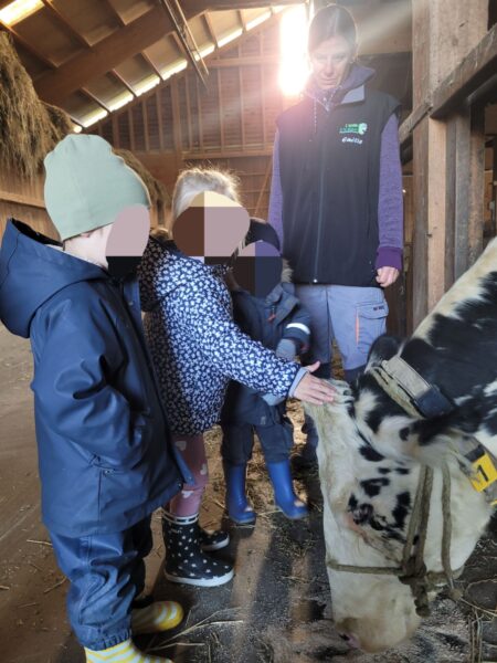 Nous découvrons également ce que mange et produit une vache. Lorsque nous parlons de leur fourrage, nous leur expliquons avec des mots simples, des conséquences dramatiques pour nos vaches des déchets sauvages en bord des routes. Les enfants comprennent très vite que les animaux peuvent en mourir.