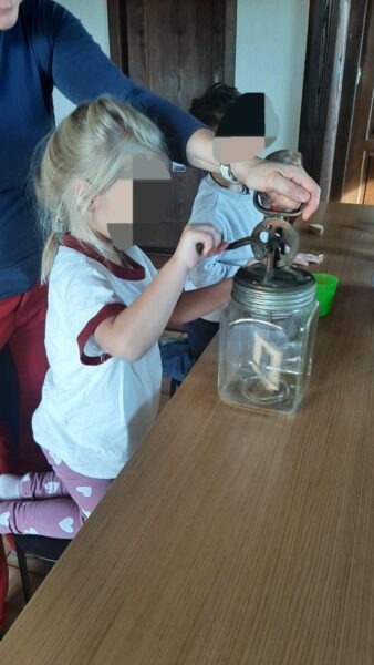 Après le transfert en chariote à la ferme des Bois, nous partons en salle pour confectionner du beurre.