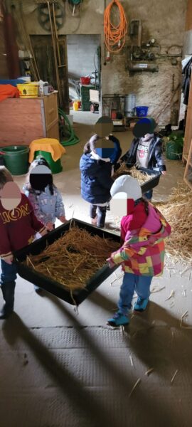 Après une récré bien méritée, nous faisons 2 groupes. Un groupe vient avec moi nettoyer les bacs des lapins, y remettre de la paille propre et leur donner à manger et à boire. Je leur explique que le nettoyage se fait une fois par semaine mais que nous leur donnons à manger et à boire tout les jours. Quelle joie de voir les élèves exécuter ces tâches avec sourire et enthousiasme. Merci les enfants pour votre aide!