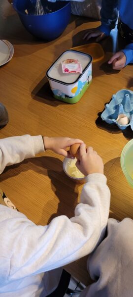 Les câlins terminés, nous allons en salle confectionner des madeleines en forme de petits lapins. Mains lavées, manches retroussées, nous voilà prêts pour peser, ajouter et mélanger les ingrédients afin de faire une pâte à madeleines. Pendant la cuisson de nos petits lapins, nous allons gaiement faire la récréation.