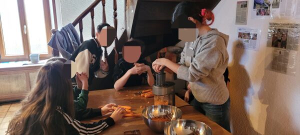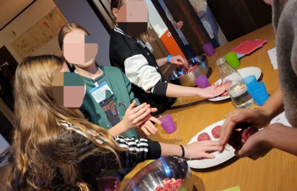 En plusieurs équipe je répartie les tâche suivante : cuire le lard et les différents steaks, laver la salade, couper les oignons et les tomates séchées, faire la sauce à salade et la mayonnaise, couper le Gruyère et éplucher et râper les carottes. Quel travail d’équipe! J’adore toute cette activité!