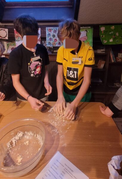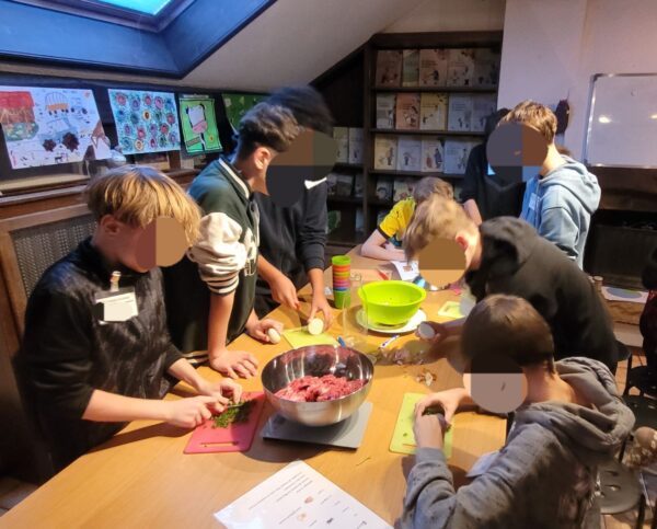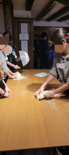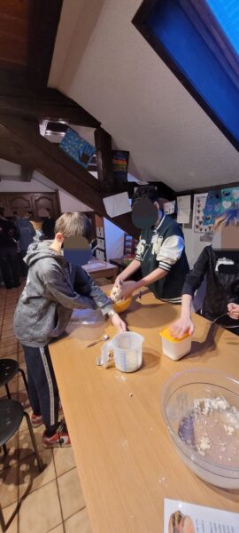 Nous démarrons la matinée par le pain. Quel est l’ingrédient principal utilisé pour la confection du pain? Comment ces céréales sont elles cultivées ou encore combien rapporte un hectare de blé conventionnel et de blé bio (en expliquant que cela varie d’une année à l’autre et pourquoi). Nous parlons des différentes étapes du labour à la livraison du blé. Tout en expliquant si oui ou non nous traitons nos cultures. Après la théorie soutenue par des affiches et jeu d’images nous voilà à la confection de la pâte à pain. Une belle énergie donnée pour le pétrissage des pâtes à pain! Bravo les jeunes pour votre implication!