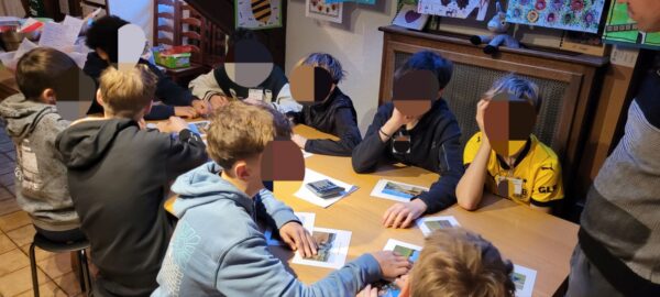 Une fois repus, les élèves vont un moment dehors prendre l’air. Je les rejoins dehors pour les emmener au jardin pour comprendre notre choix de tomates séchées. Je leur demande d’observer les légumes qui s’y trouvent. Ils remarquent rapidement qu’il n’y a pas de tomate et font de suite le lien que ce n’est pas de saison. Pour parler des légumes de saison, je leur distribue à chacun une image d’un légume. Les jeunes ont dû placer les images sous la saison à laquelle on récolte le légume. Pas si facile que ça. J’en profite de leur dire qu’ils sont les consommateurs de demain, et qu’ils auront bientôt un choix à faire de consommer de saison et local ou hors saison et d’ailleurs.