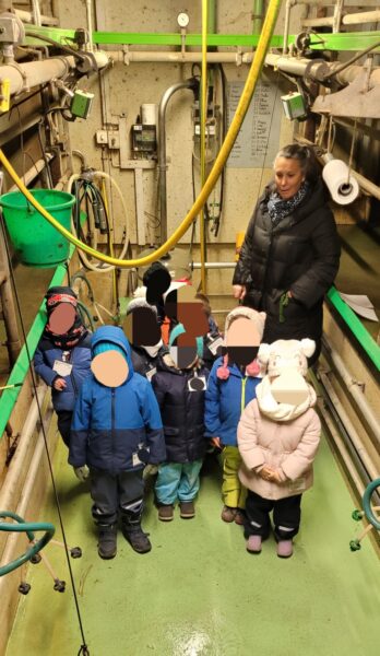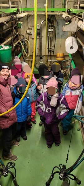 Une fois les câlins terminés, nous faisons 2 groupes. Un groupe vient avec moi découvrir la salle de traite et son fonctionnement, la chambre à lait et ce qu’on produit avec du lait puis nous allons jusque dans le box des veaux pour les câliner. Trop chou!