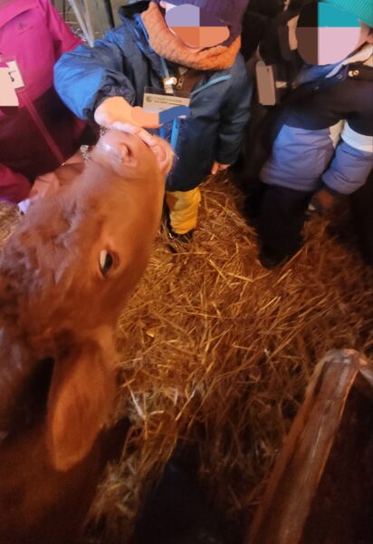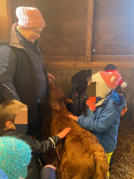 Après quelques questions, nous allons dans l’étable pour approcher et caresser les vaches. Que d’étoiles dans les yeux des élèves à l’approche de nos vaches! Nous découvrons également comment est constitué l’étable.