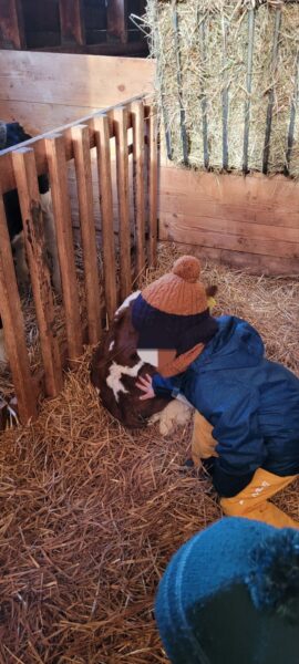 Une fois arrivés, nous allons observer les génisses (adolescentes des vaches) et découvrir les chèvres. Nous en profitons pour les caresser.
