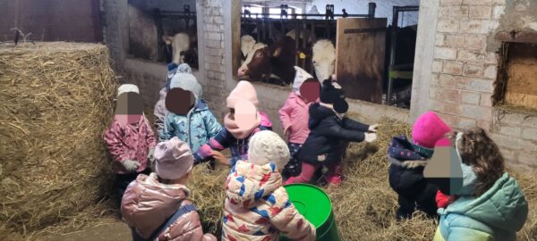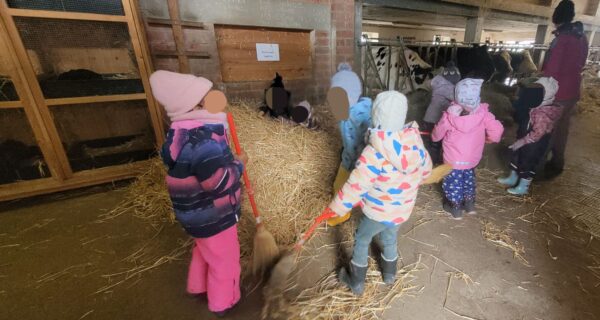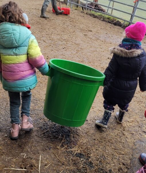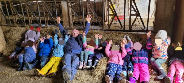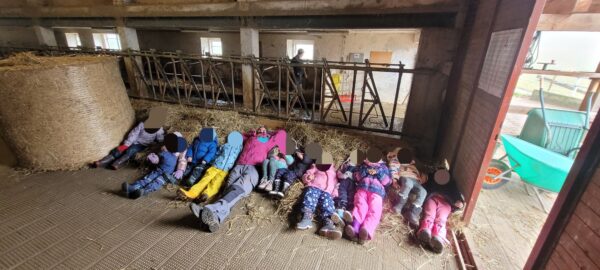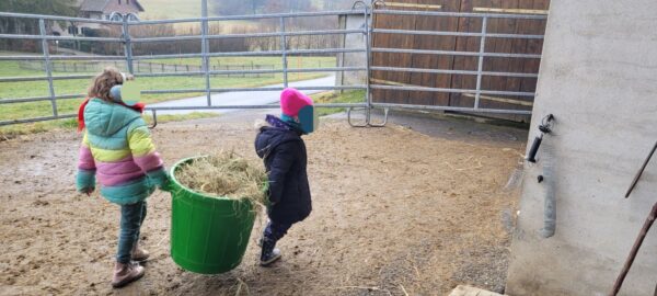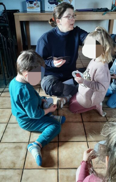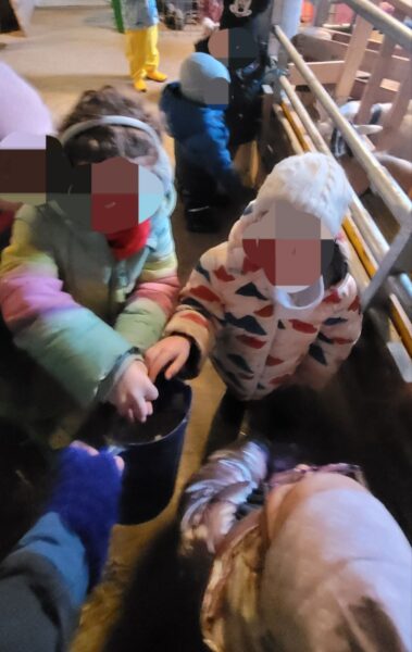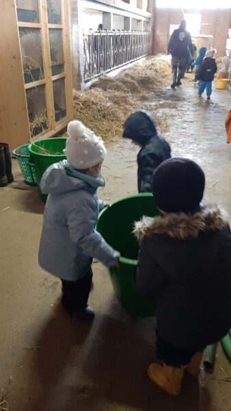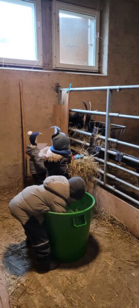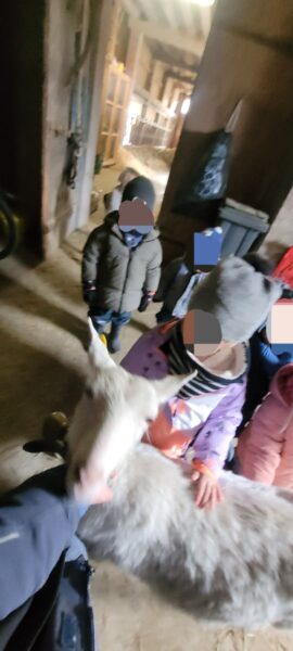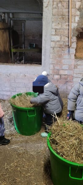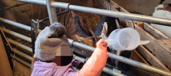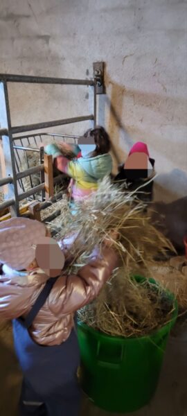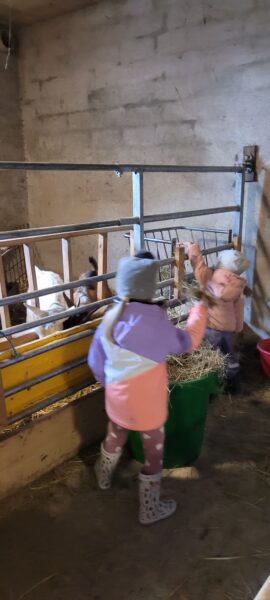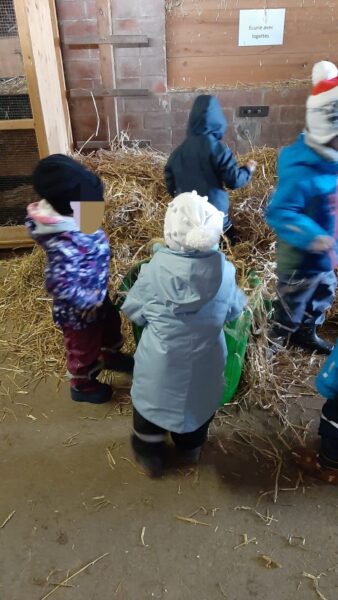 Lors de ces ateliers, les enfants ont nourri et abreuvé les chèvres. Je leur fais découvrir la nourriture des chèvres; le foin qui est leur aliment principal en hiver et la farine, (mélange de blé, orge, maïs et sel minéraux : leur bonbon). Une fois nourri, nous leur faisons la litière avec de la paille. Pour chaque chose qu’on utilise ou donne, j’explique aux enfants ce que c’est, d’où ça vient et comment il est produit.