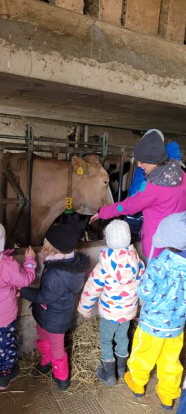 Si nous avons un peu de temps à disposition, nous observons et caressons les génisses ou/et les lapins.