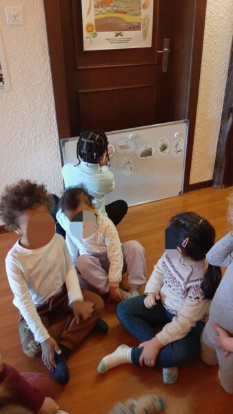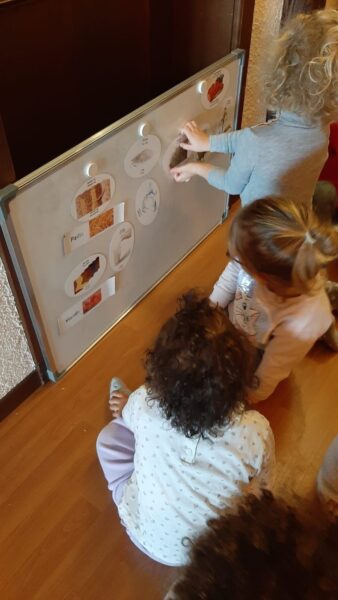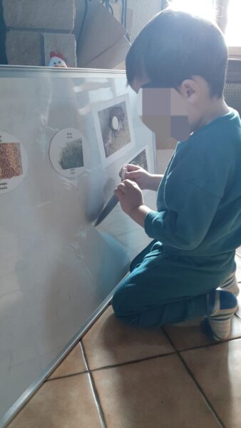 En salle, après une récré bien méritée, nous parlons de certaines particularités de la chèvre, de ses besoins pour vivre et de ce qu’elle produit. Nous le faisons avec des images aimantées que les enfants vont déposer l’un après l’autre sur notre panneau blanc.