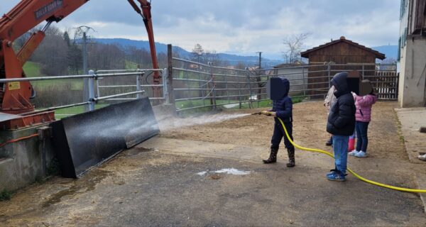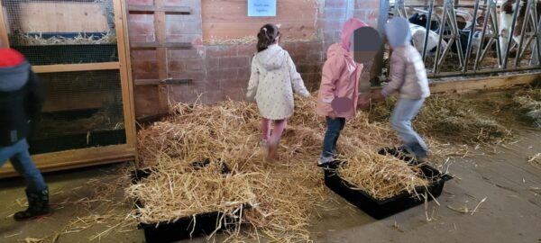 Un premier groupe est venu avec moi pour s’occuper des lapins : nettoyage des clapiers, distribution de nourriture (grains et foin) et d’eau, et observation de leurs besoins quotidiens. Ce fut aussi l’occasion d’un moment de tendresse avec les lapereaux.