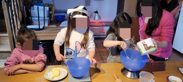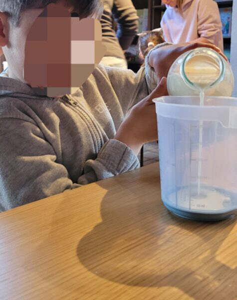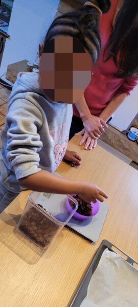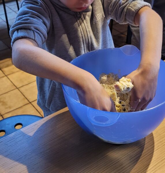 Après cette introduction, nous nous sommes dirigés en salle pour un atelier culinaire autour des œufs de nos poules. Les élèves ont mis la main à la pâte pour réaliser de délicieux scones aux raisins secs. Cet atelier leur à permis de peser et mesurer les ingrédients, casser les œufs et pétrir le tout.