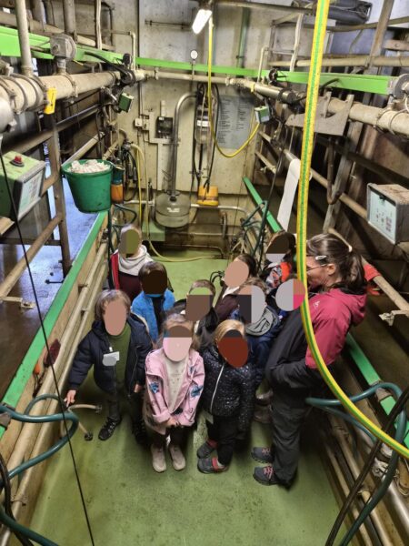 Pendant ce temps, Émilie Faisait découvrir aux les élèves les membres de sa famille, ce qu’elle produit, le fonctionnement de ses quatre estomacs et les dangers des déchets au bord des routes pour leur sécurité et leur digestion. Et pour finir, les élèves ont pu traire notre vache à Alsace, un bel exercice pour comprendre le geste et le rythme de la traite.