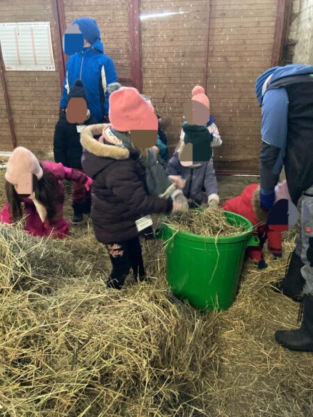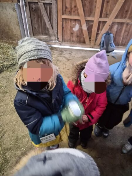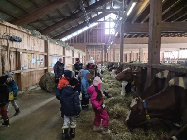 Dès le matin, direction l’étable ! Les enfants ont découvert comment les vaches mangent, se déplacent et interagissent entre elles. Ils ont aussi pu constater que, tout comme nous, elles ont chacune leur personnalité : certaines raffolent des câlins, d’autres préfèrent garder leurs distances, et quelques-unes semblent sourire lorsqu’on leur parle doucement. Un moment tendre et plein d’émotions, où les enfants ont pu approcher les vaches pour les caresser et appris à observer et à respecter les animaux.