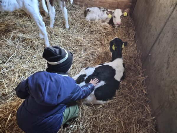 Pendant ce temps, l’autre groupe a découvert la salle de traite, la chambre à lait et nos jeunes veaux : comment on recueille le lait, à quoi servent les machines à traire, et comment tout cela se passe dans le respect du bien-être animal. La visite s’est terminée en douceur auprès des jeunes veaux, pour un moment câlin et plein de tendresse.