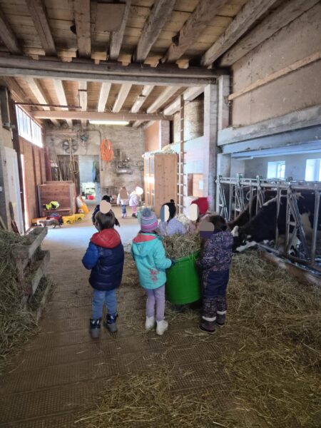 Dès le matin, direction l’étable ! Les enfants ont découvert comment les vaches mangent, se déplacent et interagissent entre elles. Ils ont aussi pu constater que, tout comme nous, elles ont chacune leur personnalité : certaines raffolent des câlins, d’autres préfèrent garder leurs distances, et quelques-unes semblent sourire lorsqu’on leur parle doucement. Un moment tendre et plein d’émotions, où les enfants ont pu approcher les vaches pour les caresser et appris à observer et à respecter les animaux.