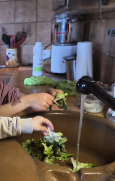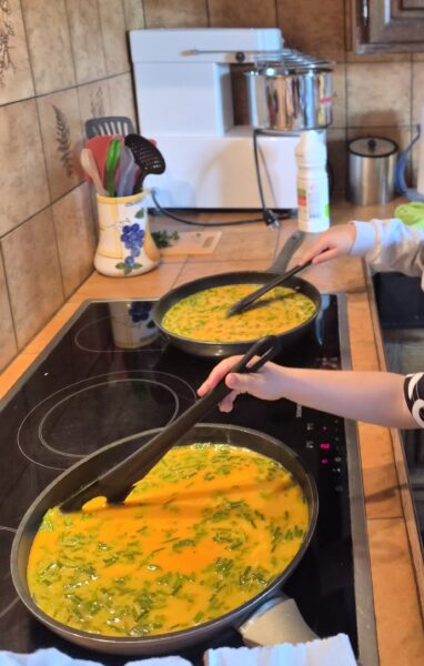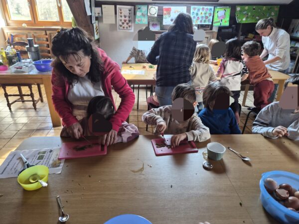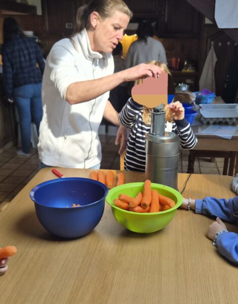 Chaque enfant a pu mettre la main à la pâte : Nous commençons par la préparation du mélange pour l’omelette : casser les œufs, ajouter le lait, le sel et les herbes aromatiques, mélanger… Un vrai travail d’équipe, gourmand et participatif, où chacun a trouvé sa place. Puis nous continuons par éplucher les carottes. Chaque élève a sa carotte à éplucher.