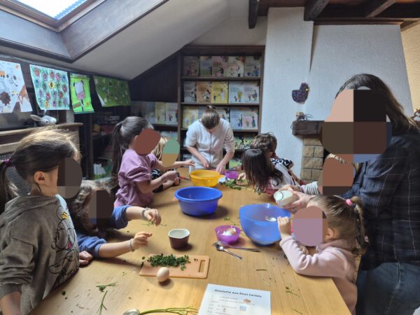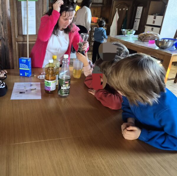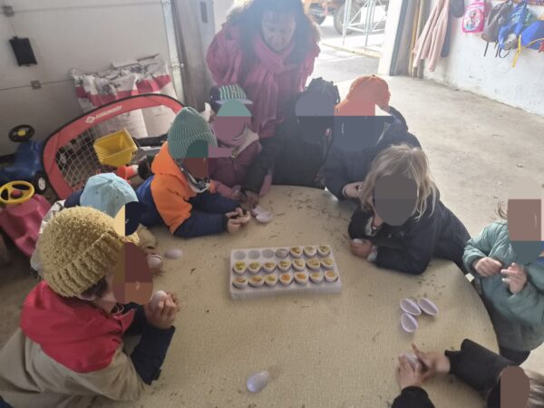 Un groupe est parti avec Émilie, pendant que l’autre venait avec moi, chacun se rendant dans un poulailler. Les enfants ont ainsi pu donner à manger et à boire aux poules, découvrir le travail réalisé chaque matin à la ferme et observer de près la vie quotidienne de la basse-cour. Quelques œufs ont été soigneusement ramassés avant de poursuivre l’aventure.