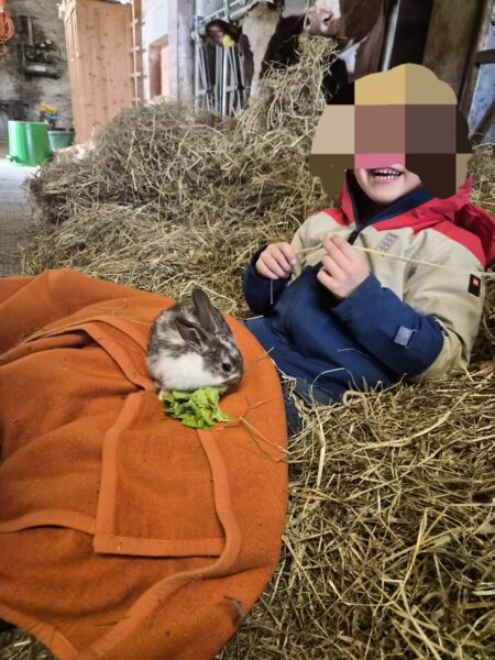 Avec moi, les enfants sont partis à la rencontre des lapereaux. Aligné devant le clapier, une couverture sur les jambes, les élèves ont pu accueillir sur leurs genoux un lapereaux d’un mois. Les enfants sont restés super calme, BRAVO !!!
