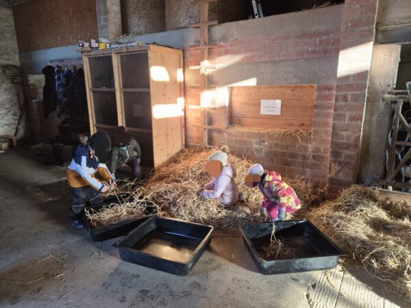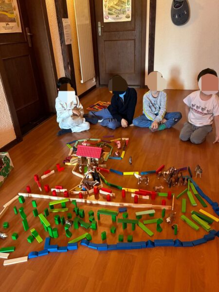 Pendant ce temps, le groupe qui n’était pas au poulailler profitait d’un moment de jeu libre avec Annik : jeux de construction, Duplo, petits animaux, et même la construction d’une ferme miniature. Chacun avançait à son rythme, explorant et créant selon ses envies seul ou avec ses camarades.