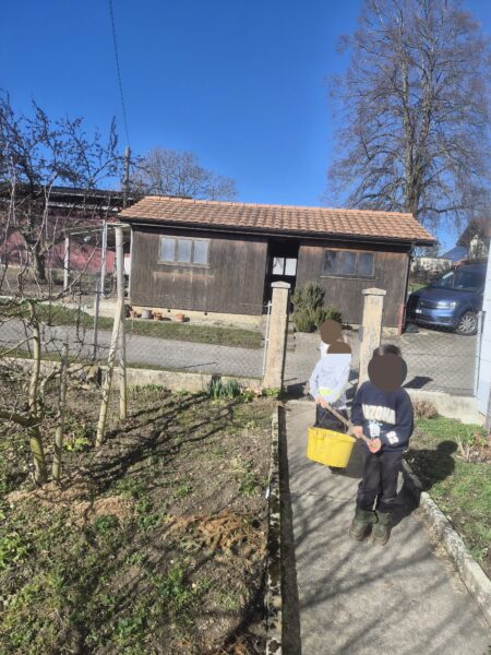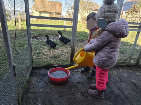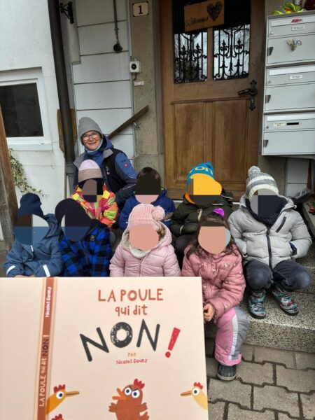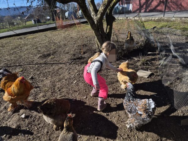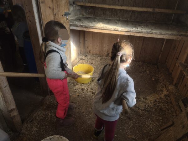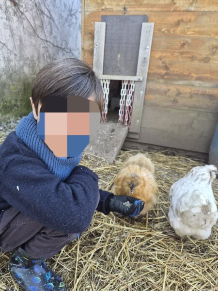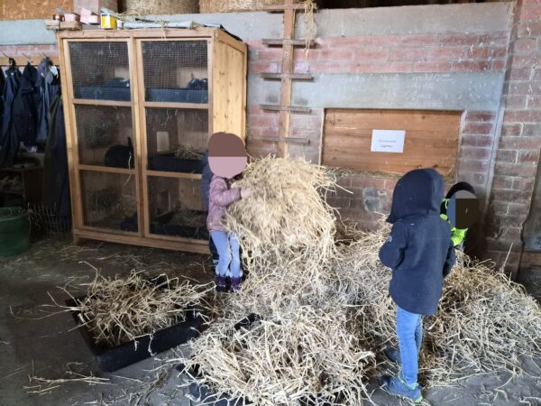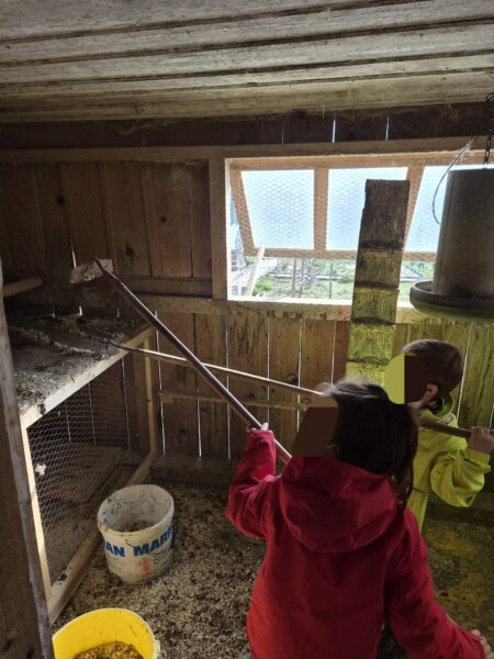 Avec moi, le premier groupe partait au poulailler pour s’occuper des poules : enlever les fientes (caca), mettre de la litière toute propre, donner à manger et à boire, et bien sûr ramasser les œufs !