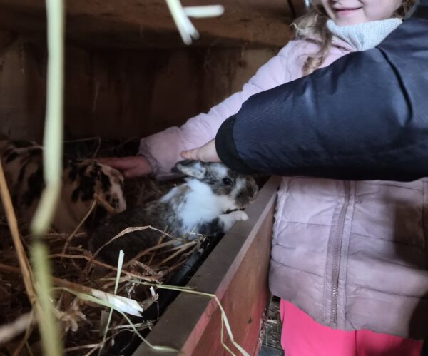 Le premier groupe venait avec moi pour s’occuper des clapiers des lapins : enlever la litière souillée, mettre les pétoles sur le tas de fumier, passer un petit coup de jet d’eau pour nettoyer, puis remettre de la paille fraîche, donner des grains, du foin et de l’eau à chaque lapin. Lors de la première matinée, j’expliquais aux enfants que chaque animal a ses besoins : certains nettoyages se font une fois par semaine, mais nourrir les animaux, c’est tous les jours, tout comme nous avons besoin de manger chaque jour. Nous finissions par un petit coup de balai pour laisser la grange propre. Puis nous allions apporter du foin et de l’eau fraiche aux chèvres.