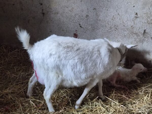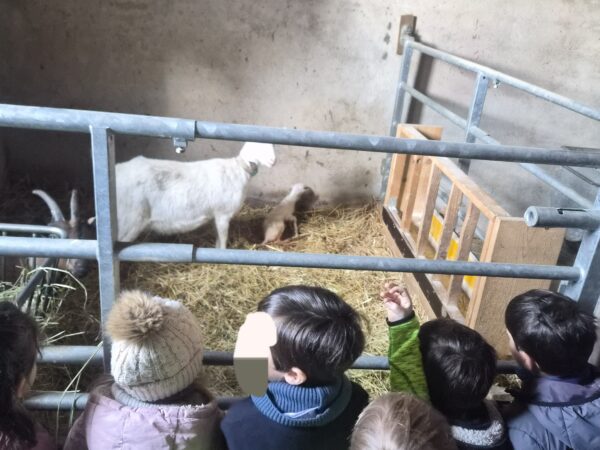 Lors d’une matinée, les enfants ont pu voir Marquise, notre chèvre blanche, mettre au monde une jolie chevrette, nommée Fraise.