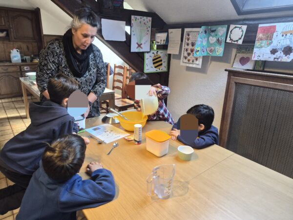 La dernière matinée du module, nous nous occupons de nourrir les animaux en première partie de matinée et nous cuisinons des madeleines en deuxième partie de matinée afin que les élèves puissent transformer les œufs qu’ils ont récolté durant leur stage et repartir avec le fruit de leur travail à la maison.