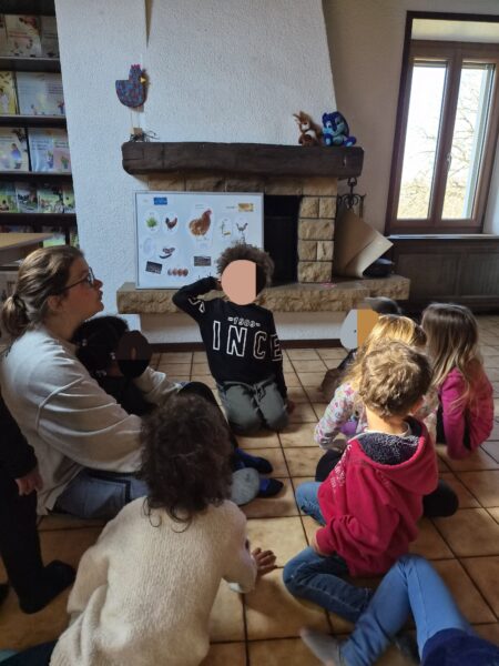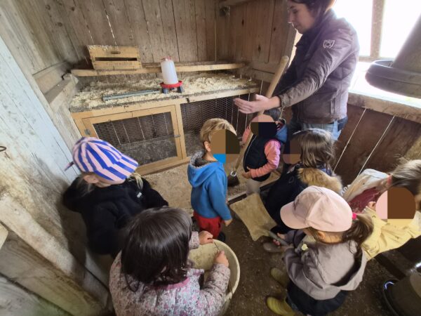 C’est sur deux demi-journées, entre un mardi après-midi et un mercredi matin, que nous avons eu le plaisir d’accueillir un groupe de jeunes enfants âgés d’environ deux ans et demi à cinq ans pour une toute première découverte de la vie à la ferme… et plus particulièrement du monde des poules.